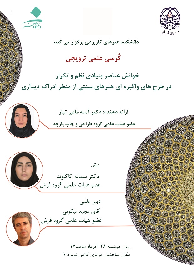 کرسی علمی ترویجی با موضوع: خوانش عناصر بنیادی نظم و تکرار در طرح های واگیره ای هنرهای سنتی از منظر ادراک دیداری ۲۶ آذر ۱۴۰۱ | ۰۷:۳۴ کد : ۵۱۳۹ در دانشکده چه میگذرد؟ ارسال به دیگران نام شما ایمیل شما ایمیل دریافتکننده ارسال انصراف تعداد بازدید:۳۹۸
