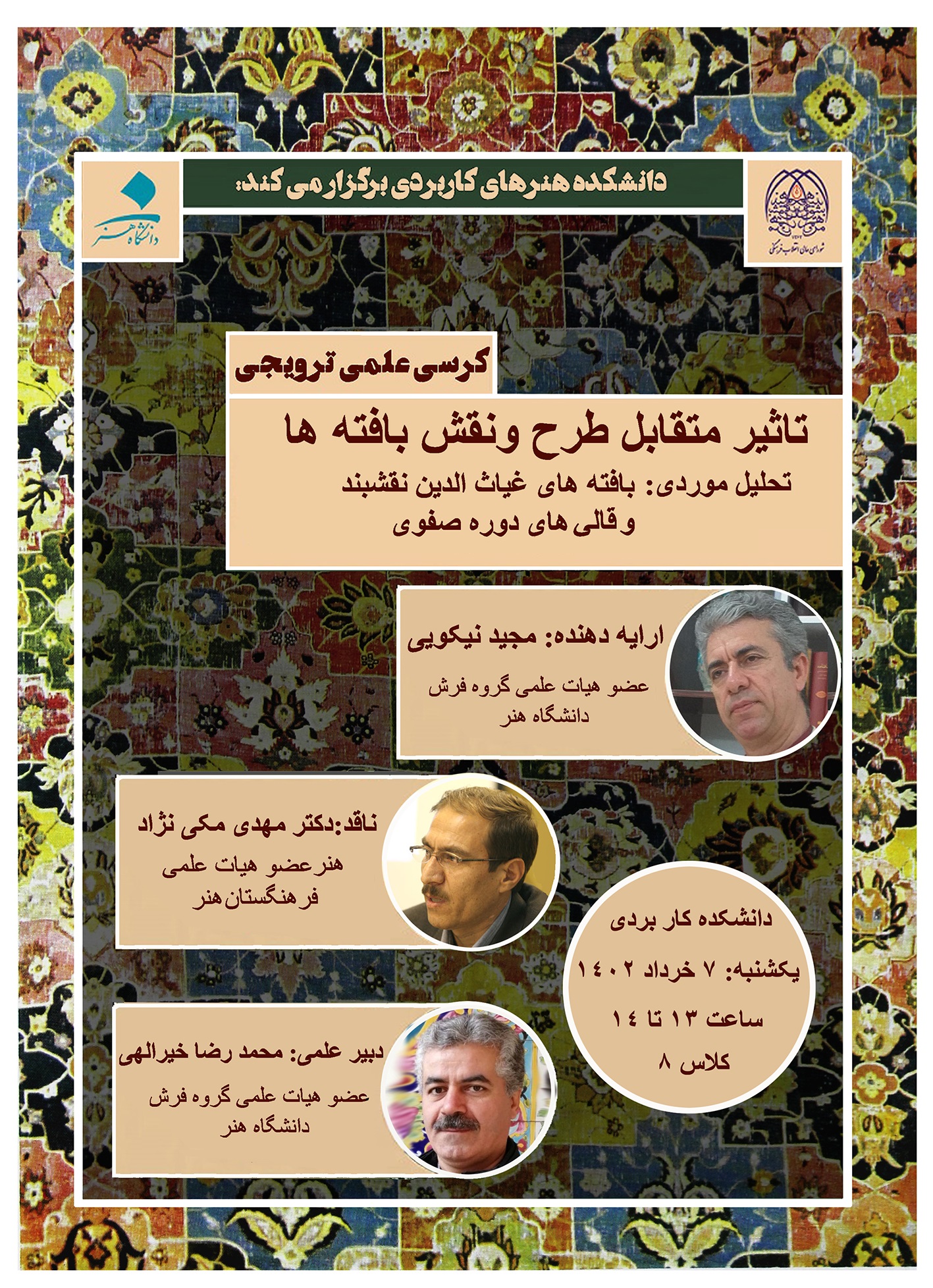 کرسی علمی ترویجی با موضوع:بافته های غیاث الدین نقشبند و قالی های دوره صفوی ۰۳ خرداد ۱۴۰۲ | ۰۸:۳۹ کد : ۵۴۶۴ در دانشکده چه میگذرد؟ ارسال به دیگران نام شما ایمیل شما ایمیل دریافتکننده ارسال انصراف تعداد بازدید:۳۴۴