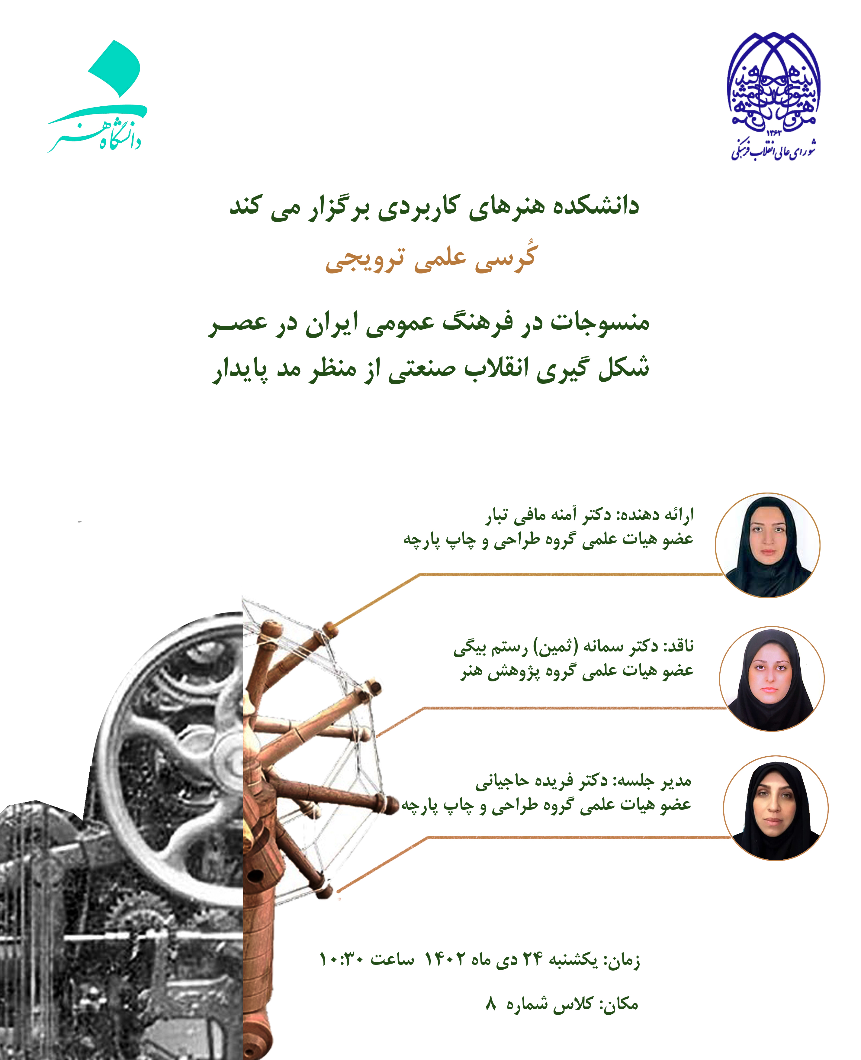 برگزاری کرسی علمی ترویجی با عنوان: منسوجات در فرهنگ عمومی ایران در عصر شکلگیری انقلاب صنعتی ازمنظر مد پایدار ۱۶ دی ۱۴۰۲ | ۱۲:۲۶ کد : ۵۹۷۶ در دانشکده چه میگذرد؟ ارسال به دیگران نام شما ایمیل شما ایمیل دریافتکننده ارسال انصراف تعداد بازدید:۴۳۰