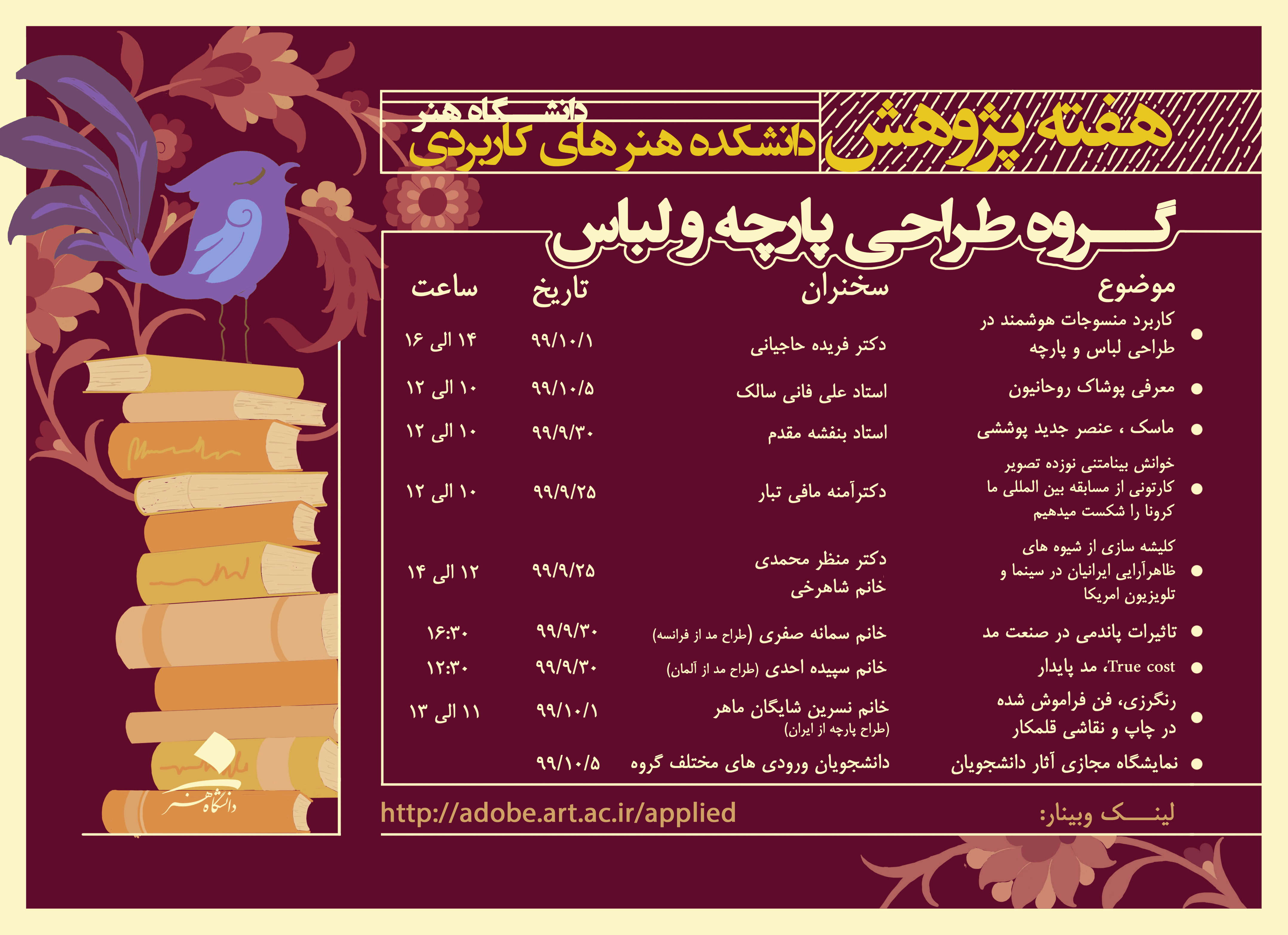 برنامههای هفته پژوهش گروه آموزشی طراحی و چاپ پارچه تعداد بازدید:۶۴۹ ارسال به دیگران نام شما ایمیل شما ایمیل دریافتکننده ارسال انصراف برای شرکت در وبینارها میتوانید با کلیک کردن بر آیکون روبرو، در تاریخ و ساعت تعیین شده در سالن مجازی سمینار حضور یابید